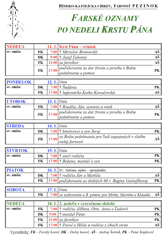 - Pripomíname možnosť prihlásiť sa na Kurz Alfa pre dospelých, ktorý začína 1. februára 2026. Stretnutia budú prebiehať každú nedeľu o 18:00 v Kláštore kapucínov v Pezinku. Celkovo ide o 11 stretnutí a spoločnú víkendovku. Prihlásiť sa dá aj prostredníctvom QR kódu na plagáte, ktorý nájdete na výveske pred kostolom. Prihlásiť sa môžete aj na stránke farnosti Pezinok alebo na adrese: https://www.pezinskerodiny.sk/alfa/ .
