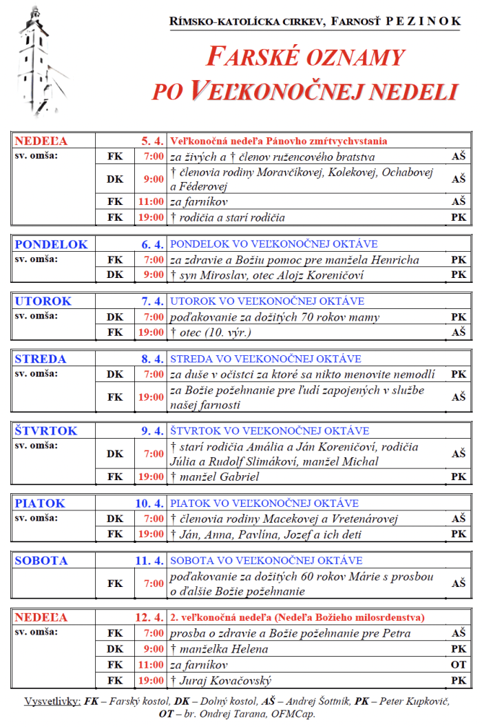 - Horliteľ Ružencového bratstva oznamuje, že dnes modlitbové stretnutie NEBUDE. Ružencové bratstvo sa stretne vo Farskom kostole ma budúcu nedeľu 12.4. 2026 o 14:15.